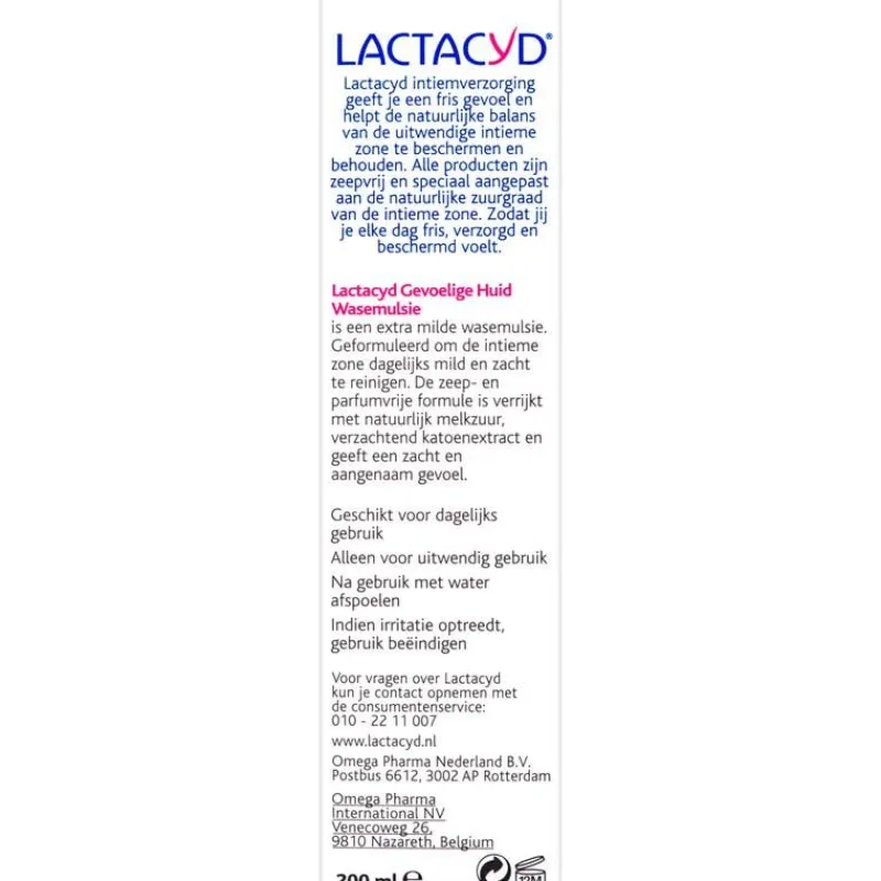 Lactacyd Gevoelige huid is een extra milde wasemulsie die verzacht en ondersteunt.De zeep- en parfumvrije formule is verrijkt met natuurlijk melkzuur, verzachtend katoenextract en geeft een zacht en aangenaam gevoel. Alle producten zijn zeepvrij en speciaal aangepast aan de natuurlijke zuurgraad van de intieme zone. Zodat jij je elke dag fris, verzorgend en beschermd voelt.Dermatologisch getest, Klinisch bewezen doeltreffend en mild.