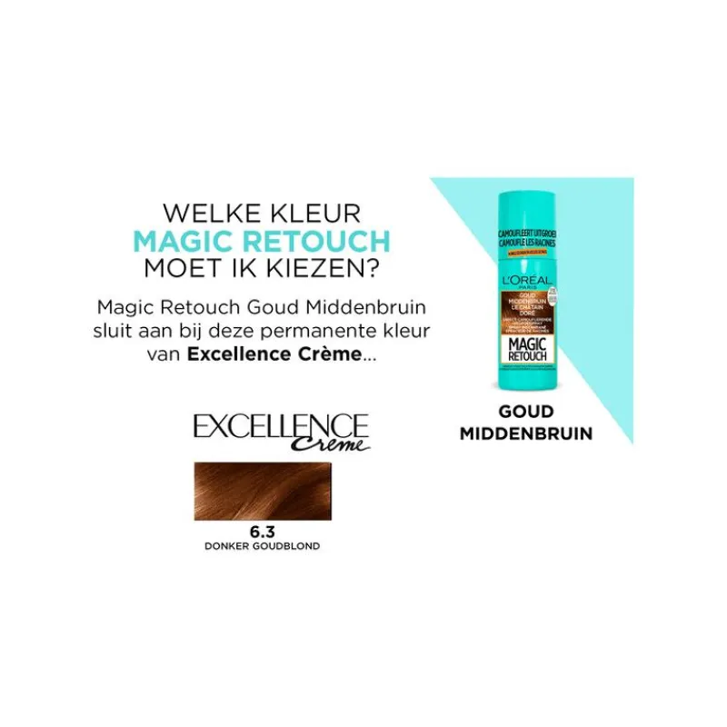 L’Oréal Paris Magic Retouch is een uitwasbare, camouflerende uitgroeispray die jouw uitgroei in 3 seconden laat verdwijnen. De uitgroeispray camoufleert uitgroei tot de eerstvolgende wasbeurt met shampoo. Wanneer je jouw haar kleurt, wordt uitgroei tussen de kleurbeurten door zichtbaar. Magic Retouch uitgroeispray is ontwikkeld om deze uitgroei te camoufleren. Magic Retouch zit in een spuitbus, waardoor je met het handige spraysysteem de formule snel en eenvoudig aanbrengt. De spray mengt zich met de haarkleur van het gekleurde haar, waardoor kleurverschil tot een minimum wordt beperkt en het resultaat natuurlijk oogt. De uitgroeispray dekt uitgroei volledig en is ideaal voor het camoufleren van grijs haar. De formule droogt snel en blijft de hele dag goed zitten. Met behulp van shampoo is de uitgroeispray direct uitwasbaar. Magic Retouch uitgroeispray is beschikbaar in verschillende kleuren. Kies de kleur die zo dicht mogelijk bij de kleur van jouw gekleurde haar ligt voor een zo natuurlijk mogelijk resultaat.