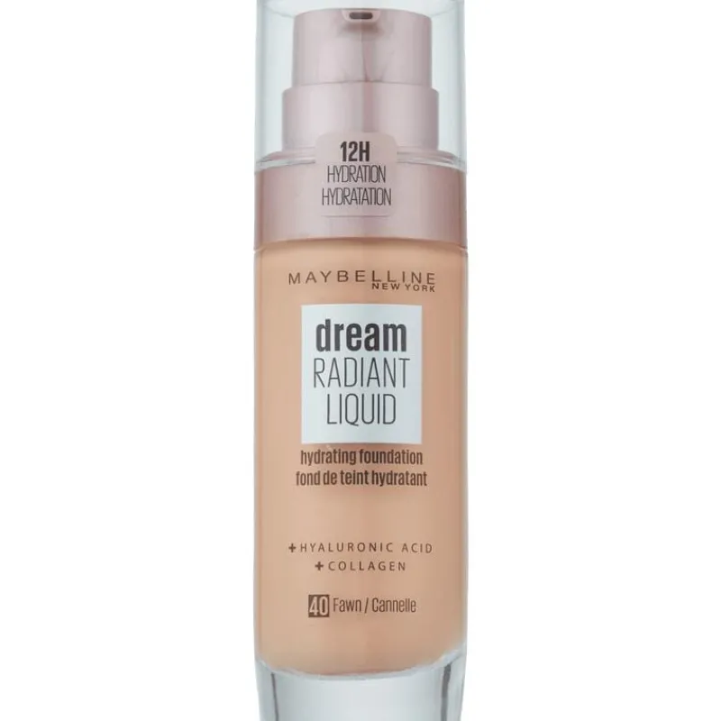 Maybelline New York Dream Radiant Liquid 40 Fawn is een foundation met verzorgend collageen en hyaluronzuur voor een egaal uitziende teint Voor een stralende huid + tot 12H hydratatie.