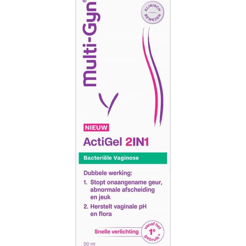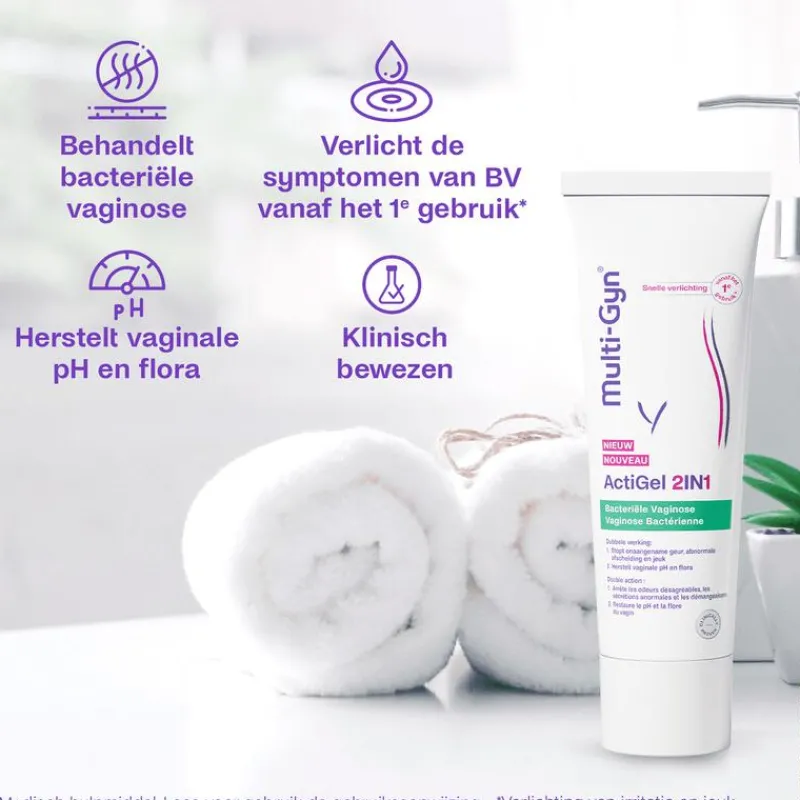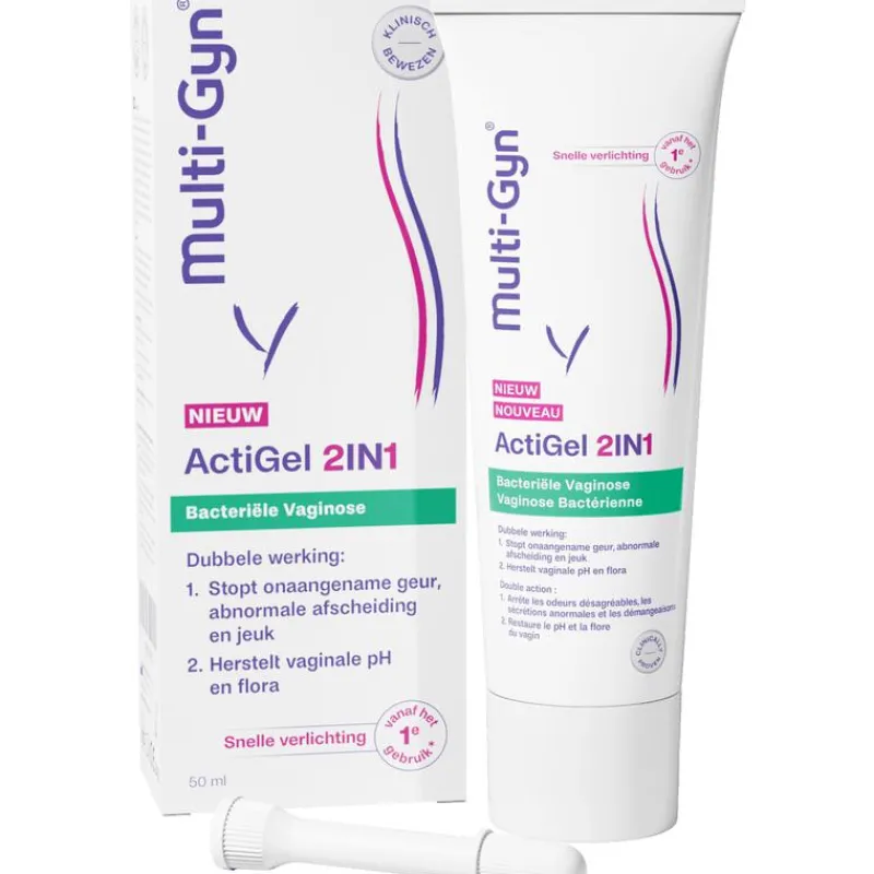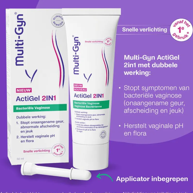 Multi-Gyn ActiGel 2in1 heeft een dubbele werking waarvan klinisch is bewezen dat het bacteriële vaginose (BV) behandelt en de pH-waarde herstelt voor een gezonde vaginale flora. Het verlicht de symptomen van BV vanaf het 1e gebruik. Het geeft een direct verzachtend effect en stopt ongemakken zoals abnormale afscheiding, visachtige geur, jeuk, irritatie en roodheid. Het bevat 2QR-complex dat het weefsel op een natuurlijke manier beschermt tegen schadelijke bacteriën.