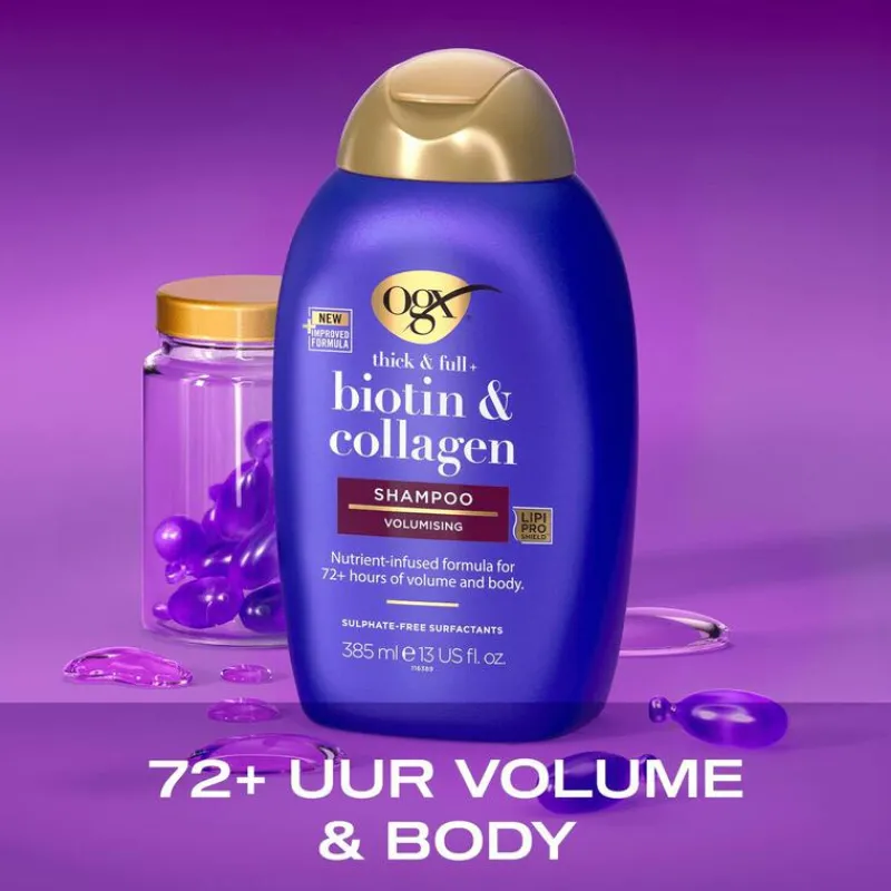 Glanzend, stevig, vol en gezond haar met OGX Biotin & Collagen Shampoo, al na één wasbeurt! De krachtige ingrediënten voeden en versterken het haar optimaal. Het verstevigende collageen geeft je haar onweerstaanbare volume.