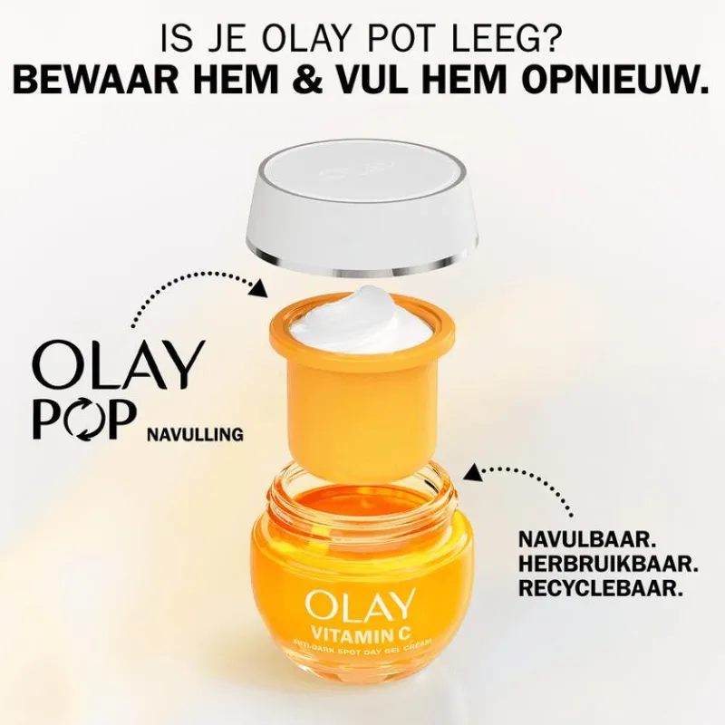 Is je glazen pot van Olay leeg? Gooi hem niet weg, maar vul hem opnieuw met een Olay POP Vitamine C SPF30 navulling. Voeg deze navulling toe aan je hydraterende dagcrème en laat je huid stralen. Dermatologisch goedgekeurd om hyperpigmentatie en door de zon veroorzaakte pigmentvlekken te helpen voorkomen. Een krachtige formule die is ontworpen voor zichtbare resultaten na verloop van tijd: biedt onmiddellijk UV-bescherming en hydrateert gedurende 24 uur; na 1 dag ziet de huid er gezond en stralend uit; al na 14 dagen zijn de teint en textuur van de huid zichtbaar egaler. De formule is vakkundig vervaardigd met een combinatie van vitamine C, een bewezen antioxidant die schade door vrije radicalen bestrijdt, en 99% pure niacinamide, die tot 10 lagen diep doordringt in de huid om celvernieuwing van het huidoppervlak te helpen activeren.