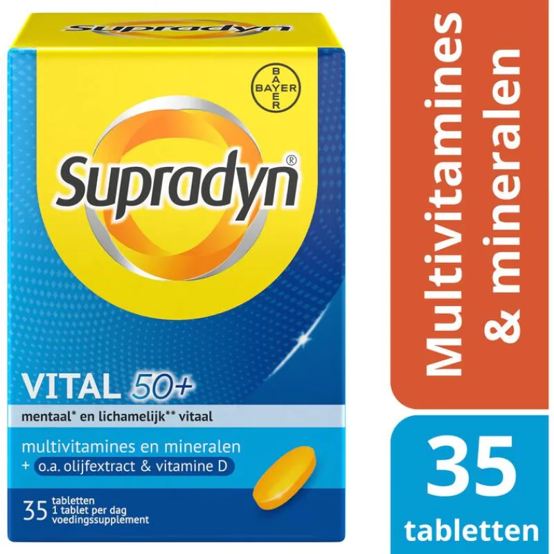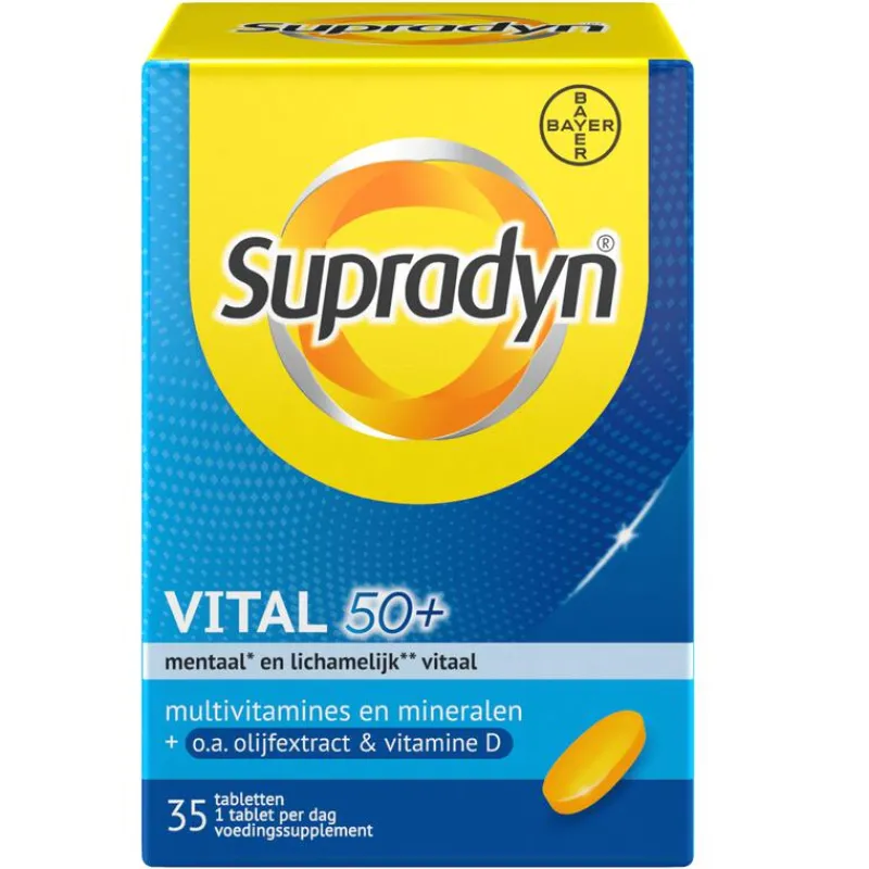 Supradyn Vital 50+ bevat een combinatie van vitamines die voorzien in de veranderende behoefte van je lichaam vanaf 50 jaar. De vitamines B1, B2, B3, B5, B6, B8, B12, C, het mineraal magnesium en het sporenelement ijzer ondersteunen je energieniveau en houden je vitaal. De mineralen ijzer, jodium en zink zijn goed voor het geheugen en behoud van een heldere geest. ;Essentiële vitamines en mineralen spelen een belangrijke rol bij de energiestofwisseling. Supradyn Vital 50+ ondersteunt je energieniveau* en helpt je om geestelijk** en lichamelijk* vitaal te blijven. *De vitamines B1, B2, B3, B5, B6, B8, B12, C, het mineraal magnesium en het sporenelement ijzer ondersteunen je energieniveau en houden je vitaal zodat je de dingen kunt blijven doen die je graag doet.;**De mineralen ijzer, jodium en zink zijn goed voor het geheugen en behoud van een heldere geest.
