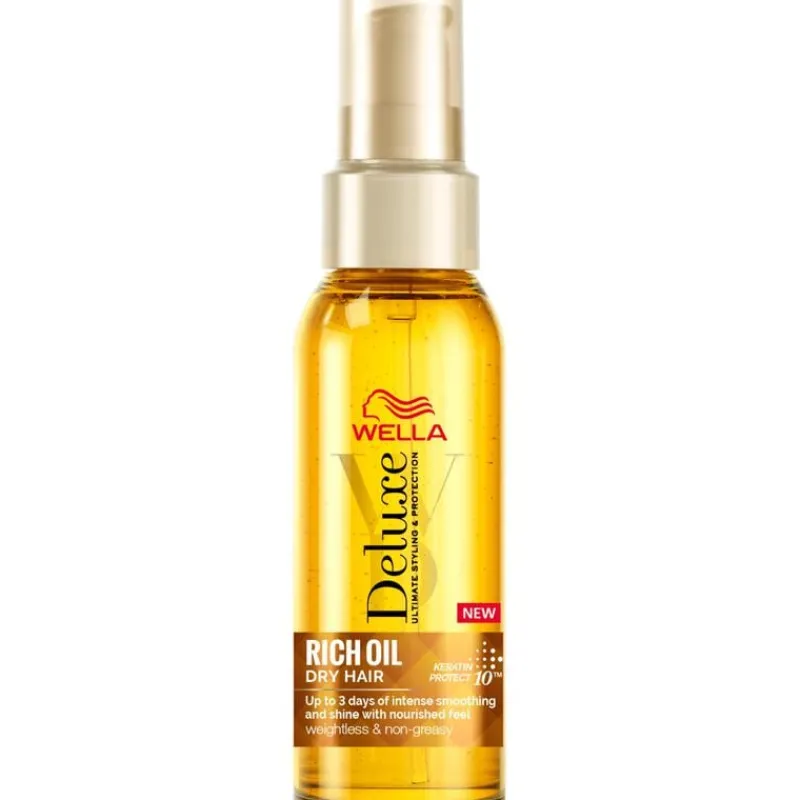 De lijn van Wella Deluxe biedt luxeuze stylingproducten voor thuis. De lijn bestaat uit een diverse haarmoussen en haarsprays die het 5-voudige Keratine beschermingscomplex bevatten, die jouw haar beschermen tegen 5 factoren van haarbeschadiging: schade door styling hitte, UV-stralen, pluishaar, dofheid en droog haar. Daarnaast heeft Wella Deluxe ook 2 haarolie’s. Doordrenkt met een mix van voedende oliën, bieden de haarolies van Wella Deluxe je haarstijl 10 voordelen: anti-breuk, voeding, gladheid, UV-bescherming van het haar, zacht gevoel, gemakkelijker kammen, ontwarren, anti-pluis, glans en handelbaarheid.