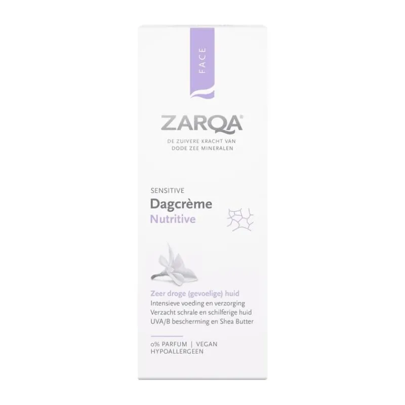 Zarqa Dagcrème Nutritive biedt intensieve voeding door de toevoeging van verzachtende, beschermende en hydraterende shea butter, macademiaolie en vitamine E. De Dode Zeemineralen en hyaluronzuur gaan uitdroging tegen en zorgen ervoor dat ruwe, schrale plekjes geen kans krijgen. Dagcrème Nutritive beschermt tegen schadelijke invloeden van buitenaf, zoals UV-straling, en maak de huid zacht en soepel. Geschikt voor alle huidtypen, in het bijzonder de (zeer) droge. Ook geschikt voor de meest gevoelige huidtypen.