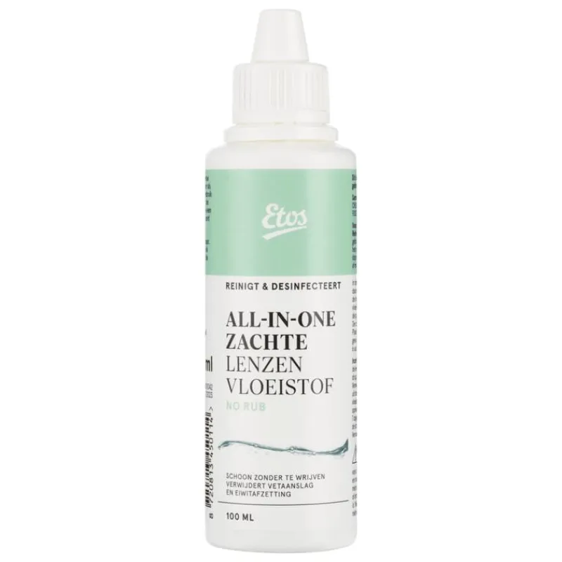 Etos All-in-one zachte lenzen vloeistof no rub is speciaal ontwikkeld voor zachte contactlenzen. De unieke no rub formule reinigt en desinfecteert de lens. Na het bewaren hoef je de lens niet meer schoon te wrijven. Met Etos all-in-one vloeistof no rub onderhoud jij zorgvuldig je lenzen.