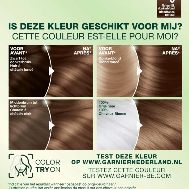VOORZORGSMAATREGELEN HAARKLEURSTOFFEN KUNNEN ERNSTIGE ALLERGISCHE REACTIES VEROORZAKENLees en volg de instructies.Dit product is niet bestemd voor gebruik bij personen jonger dan 16 jaar.TIJDELIJKE TATOEAGES MET ZWARTE HENNA KUNNEN LEIDEN TOT EEN VERHOOGD RISICO OP EEN ALLERGISCHE REACTIE.Kleur uw haar niet als:• u last heeft van uitslag in het gezicht of van een gevoelige, geïrriteerde of beschadigde hoofdhuid• u eerder een reactie na een haarkleuring heeft gehad• u in het verleden een reactie heeft gehad na een tijdelijke tatoeage met zwarte hennaALLERGIE NEGEREN KAN LEVENSBEDREIGEND ZIJN Het is noodzakelijk een ALLERGIE WAARSCHUWINGSTEST 48 uur vóór iedere haarkleurbehandeling uit te voeren zelfs indien u al eerder een kleurproduct heeft gebruikt.Denk eraan het product 48 uur van te voren te kopen. (lees en volg de gebruiksaanwijzing). Bij een reactie of bij twijfel, raadpleeg een arts voordat u een kleurproduct gebruikt.”De ontwikkelvloeistof’’ bevat waterstofperoxide.“Het kleurproduct”a bevat: fenyleendiaminen, resorcinol, fenyleendiaminen (tolueendiaminen), ammoniak.• Bijgevoegde handschoenen dragen.• Contact van het product met de ogen vermijden. Niet gebruiken voor het kleuren van wimpers of wenkbrauwen. • Bij contact van het product met de ogen onmiddellijk met overvloedig water spoelen • Spoel het haar na de inwerktijd van het product goed uit.Wacht 2 weken na een permanent of een behandeling met een duurzaam gladmakend product.Niet gebruiken als uw haar gekleurd is met henna of een progressieve kleuring. Buiten bereik van kinderen houden.VOLG DE GEBRUIKSAANWIJZING Raadpleeg de ingrediëntenlijst onder dit kader.