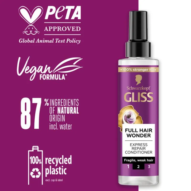 Schwarzkopf Gliss Full Hair Wonder Anti-Klitspray maakt het haar direct makkelijk doorkambaar, versterkt de haarlengtes voor voller haar en voorkomt haarverlies door haarbreuk.