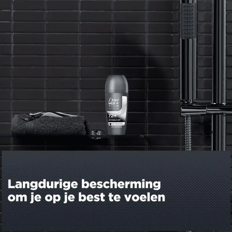 Dove Men+Care Advanced Invisible Dry Anti-Transpirant Deodorant Roller beschermt tot 72 uur tegen zweet, nare geurtjes en tegen witte strepen en gele vlekken.