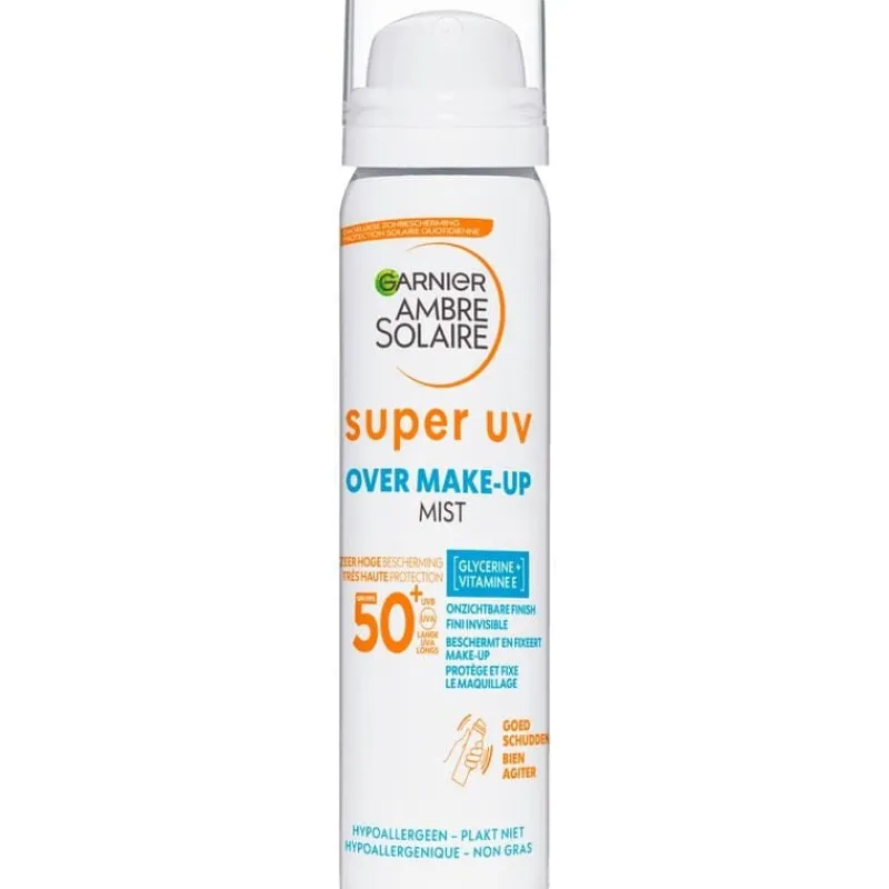 Ontdek de Super UV SPF 50+ Beschermende Make-Up Mist van Garnier Ambre Solaire. Bevat Hyaluronzuur en een hoge beschermignsfactor SPF 50. Daarnaast fixeert de lichtgewicht formule jouw make-up. – Hoge bescherming met SPF 50 UVB + UVA + Lange UVA – Formule met Hyaluronzuur – Hypoallergeen en niet-comedogeen