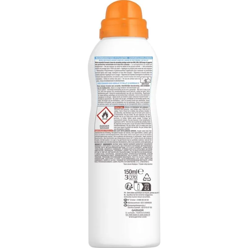 Garnier Ambre Solaire Sensitive Expert+ Hypoallergene Zonnebrand Mist SPF50+ biedt zeer hoge bescherming tegen UVB-, UVA- en lange UVA stralen. Hypoallergene zonnebrand is geschikt voor alle huidtypen, zelfs voor een gevoelige huid. Nu met Ceramide Protect, die helpt de natuurlijke huidbarrière te beschermen tegen invloeden van buitenaf, zoals (lucht)vervuiling). De dermatologisch geteste formule is waterresistent, voelt niet vettig en bevat geen alcohol*. Goed schudden voor gebruik tot balletje hoorbaar is. Goed uitsmeren. Baby’s en jonge kinderen niet blootstellen aan direct zonlicht. Overmatige blootstelling aan de zon is gevaarlijk. Blijf niet te lang in de zon, zelfs niet wanneer een zonnebrandproduct wordt gebruikt, omdat het géén 100% bescherming geeft. Breng het zonnebrandproduct aan vlak voor blootstelling. Regelmatig en royaal opnieuw aanbrengen om de bescherming te behouden, vooral na het zwemmen, transpireren of afdrogen. Buiten bereik van kinderen zonder volwassen toezicht houden. Vermijd de oogcontouren. Bij contact met de ogen, onmiddellijk en overvloedig spoelen met water. Het dragen van een hoofddeksel, T-shirt en zonnebril wordt zeer aanbevolen. Spray niet direct in het gezicht, maar op handpalmen voor het aanbrengen. Spray in een homogene en uniforme manier met draaiende beweging om alle blootgestelde delen te bedekken. Contact met alle textiel vermijden om vlekken te voorkomen. ZEER LICHT ONTVLAMBARE AEROSOL. Houder onder druk: Kan openbarsten bij verhitting. Verwijderd houden van warmte, hete oppervlakken, vonken, open vuur en andere ontstekingsbronnen. Niet roken. Niet in een open vuur of op andere ontstekingsbronnen spuiten. Ook na gebruik niet doorboren of verbranden. Tegen zonlicht beschermen. Niet blootstellen aan temperaturen boven 50°C. Buiten bereik van kinderen houden. Vermijd spuiten in de ogen of op geïrriteerde huid en opzettelijk inademen. Gebruik het product alleen voor het doel waarvoor het bestemd is. Niet in een besloten ruimte gebruiken. Garnier is gecertificeerd door Cruelty Free, zet zich voortdurend in om de ecologische en negatieve sociale impact van haar producten te verminderen tijdens hun gehele levenscyclus, dus inclusief gedurende de productie- en gebruiksfase. *Zonder ethyl alcohol. **Geen ingrediënten of bijproducten van dierlijke oorsprong.