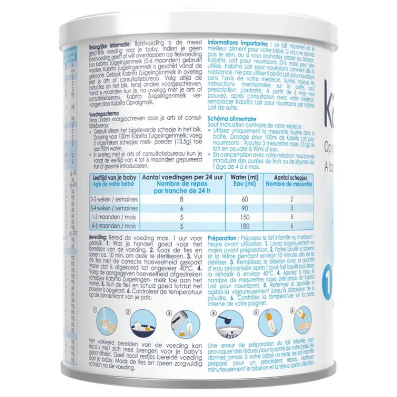 Ingrediënten: Lactose (MELK), Plantaardige oliën (1,3-Dioleoyl-2-palmitoyltriglyceride, Koolzaadolie, Zonnebloemolie), Volle geitenMELK, Geitenwei-eiwitconcentraat (MELK), Galacto-oligosachariden (MELK), 2′-Fucosyllactose (MELK), Mineralen (Calciumcarbonaat, Natriumchloride, Trinatriumcitraat, Kaliumchloride, Tricalciumfosfaat, Kaliumhydroxide, Trikaliumcitraat, Magnesiumchloride, IJzersulfaat, Zinksulfaat, Kopersulfaat, Mangaansulfaat, Kaliumjodide, Natriumselenaat), Cholinebitartraat, Fruto-oligosachariden, Olie van de microalg Schizochytrium sp., Mortierella alpina olie, L-fenylalanine, Vitaminen (L-ascorbinezuur, Natrium L-ascorbaat, DL-伪 tocoferylacetaat, Niacinamide, Calcium D-pantothenaat, Riboflavine, Thiaminehydrochloride, Pyridoxinehydrochloride, Retinylacetaat, Foliumzuur, Fytomenadion, D-biotine, Cholecalciferol, Cyanocobalamine), Inositol, Taurine, L-tryptofaan, L-carnitine L-tartraat, Bifidobacterium animalis.