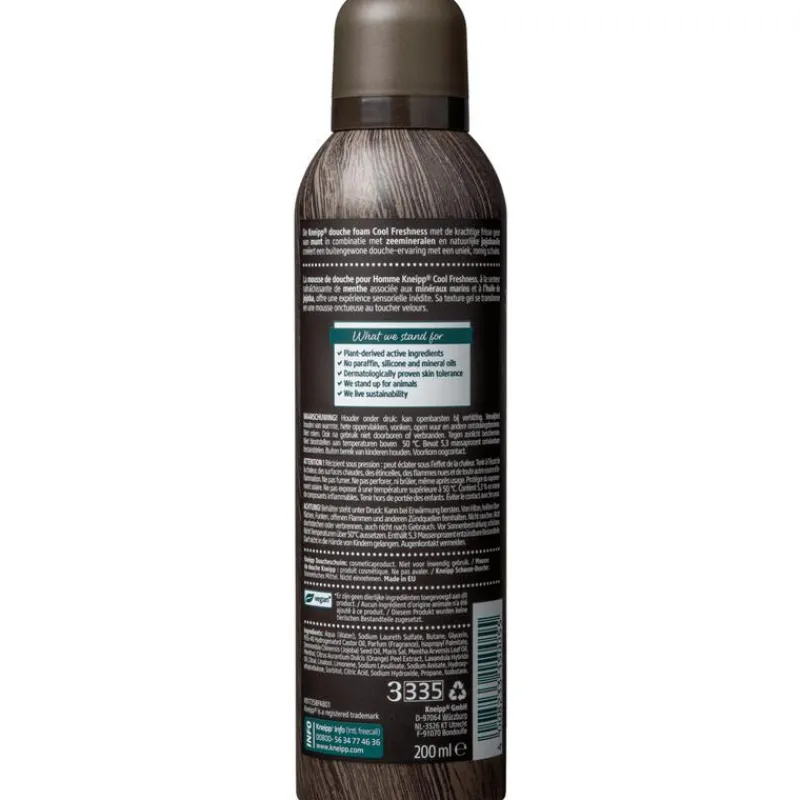 Ervaar een verkwikkende douche met de Kneipp ® douche foam Cool Freshness. De krachtige frisse geur van munt in combinatie met zeemineralen en natuurlijke jojobaolie creëert een buitengewone douche-ervaring met een uniek, romig schuim. De douche foams van Kneipp zijn makkelijk te doseren, prettig in gebruik en gedreven op perslucht.