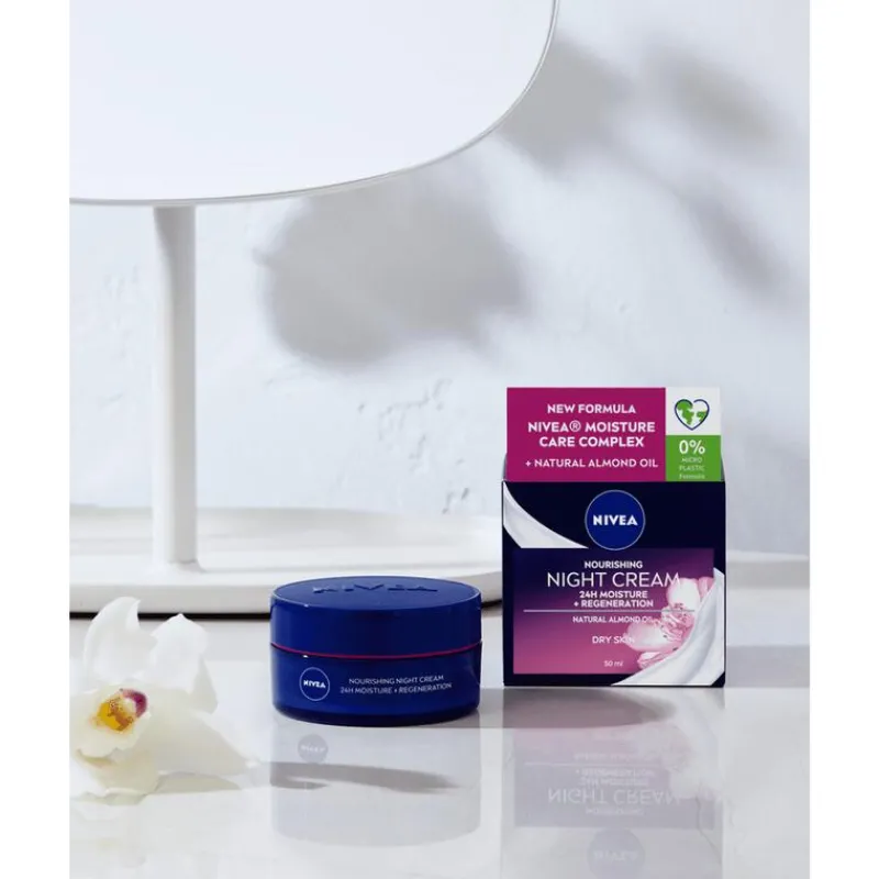 NIVEA Essentials +24H Voedende Nachtcrème geeft de huid de ondersteuning die het nodig heeft om te herstellen na een lange dag. Gedurende de nacht geniet je van diepe hydratatie, waardoor je wakker wordt met een huid die fris en soepel aanvoelt. Terwijl je slaapt wordt het herstellend vermogen van de huid ondersteunt, maar geniet je ook van bescherming tegen schade van buitenaf. De hydraterende crème voelt heerlijk aan en irriteert de huid niet. De zorgvuldig samengestelde formule is speciaal ontwikkeld voor de gevoelige en droge huid. De hydraterende gezichtscrème bevat sheaboter, rijk aan essentiële vetzuren die de huid hydrateren en ontstekingsremmend werken, ideaal voor de gevoelige huid. Natuurlijke amandelolie, rijk aan antioxidanten, beschermt tegen oxidatieve stress en vrije radicalen, terwijl vitamine B5 een droog en trekkerig gevoel tegengaat. • Voedt de huid intensief en biedt langdurige hydratatie • Versterkt het herstellend vermogen van de huid • Antioxidanten beschermen je huid tegen schadelijke invloeden • Verrijkt met sheaboter, amandelolie en vitamine B5 • Laat de droge huid comfortabel en zacht aanvoelen