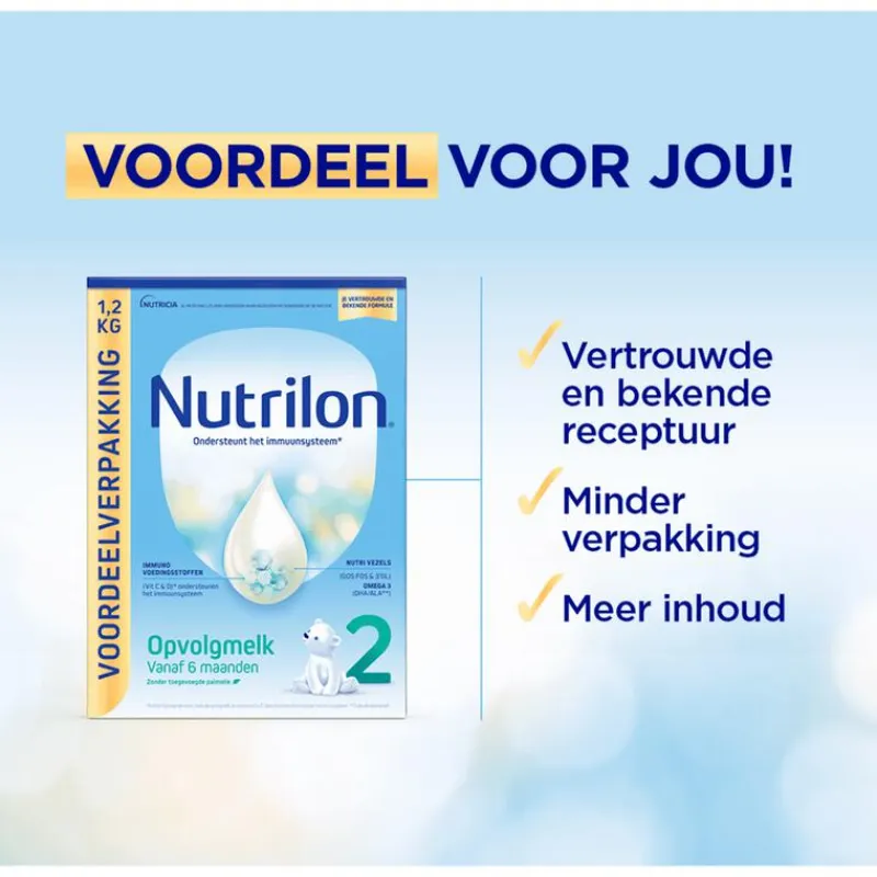 BELANGRIJK • Borstvoeding is de beste voeding voor je baby.• Wil je Nutrilon 2 gebruiken? Overleg dan met je consultatiebureau of arts.• Nutrilon 2 is een opvolgmelk, geschikt vanaf 6 maanden als onderdeel van een gezonde, gevarieerde voeding.• De eerste 6 maanden na de geboorte is Nutrilon 2 niet geschikt als vervanging van borstvoeding.