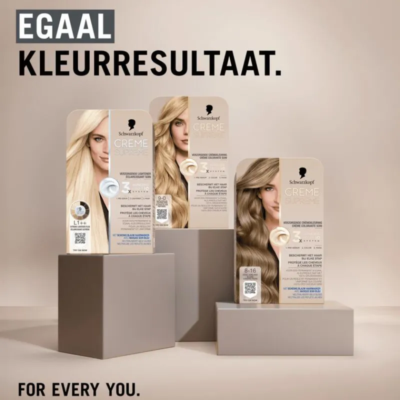Meer dan 120 jaar geleden legde de Duitse chemicus en apotheker Hans Schwarzkopf de basis voor een merk dat sindsdien altijd voorop heeft gelopen op het gebied van innovatie. De combinatie van kwaliteitsingrediënten en de nieuwste haarverzorgingstechnologie, betrouwbaarheid, expertise en vakmanschap zijn de hoekstenen van alles wat het merk doet en waar het voor staat. Creme Supreme is de meest verzorgende permanente haarkleuring van Schwarzkopf, met het 3x Bonding HAPTIQ System dat het haar beschermt bij elke stap : voor, tijdens en na het kleuren.