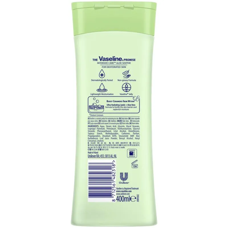 Vaseline Intensive Care Aloe Soothe Bodylotion is gemaakt met 100% aloë vera-extract en helpt je huid er gezond en gehydrateerd uit te zien. De lotion helpt verlichting te bieden bij een geïrriteerde huid, inclusief een huid die beschadigd is door overmatige blootstelling aan UV-stralen. Dit is een perfecte bodylotion voor dagelijks gebruik, aangezien de lotion snel in de huid trekt zonder een vettig gevoel achter te laten. De vochtinbrengende lotion van Vaseline gaat verder dan gewone hydratatie. Vaseline Intensive Care Aloe Soothe Bodylotion is verrijkt met aloë vera, een ingrediënt waarvan bekend is dat het de huid kalmeert. De formule met Ultra-Hydrating Lipids helpt om vocht aan te vullen en vast te houden, waardoor de natuurlijke barrière van de huid zich kan herstellen. Met een zachte, kalmerende geur is deze lotion de ideale vochtinbrengende bodylotion om de dagelijkse droogheid te verlichten en om irritatie te verzachten.