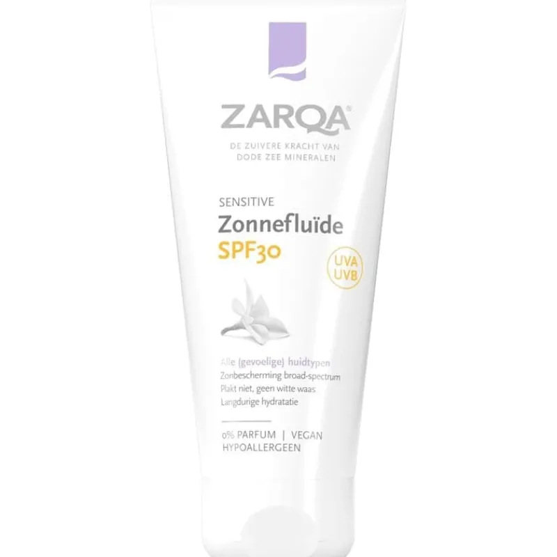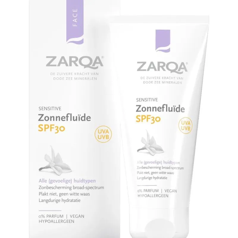 ZARQA Zonnefluïde SPF30 is dagelijkse zonbescherming met milieu- en huidvriendelijke zonnefilters voor zelfs de meest gevoelige huid. De broad-spectrum crème beschermt zowel tegen UVA- als UVB-straling en helpt beschermen tegen huidveroudering en zonnebrand. De fluïde bevat geen parfum en is verrijkt met panthenol voor langdurige hydratatie. Het krachtige anti-oxidant vitamine E beschermt de huid tegen schade door vrije radicalen. De fluïde heeft een aangename en lichtgewicht textuur die snel opgenomen wordt door de huid. Plakt niet en laat geen witte waas achter. Kan gebruikt worden bij een zon- en allergie-gevoelige huid en helpen bij het kalmeren van een geïrriteerde huid. Na gebruik is de (gevoelige) huid verzorgd en verzacht.