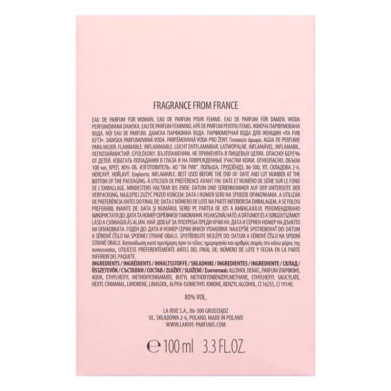 La Rive Cuté Eau De Parfum is een bloemig en fruitig damesparfum die in het jaar 2014 werd gelanceerd. De topnoten zijn zwarte bes, yuzu (Japanse citroen) en stokroos. De hartnoten worden gevormd door lelie, iris en roos. De basisnoten zijn ceder, sandelhout en muskus. Daarnaast heeft deze geur heeft een lange houdbaarheid op de huid.