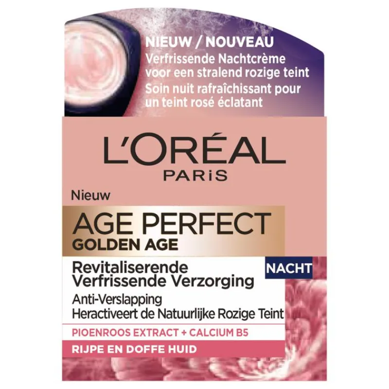 Na jaren van invloeden van buitenaf en van binnenuit heeft jouw huid nog steeds een zachte rozige gloed. Wat is je geheim? De L’Oréal Paris Age Perfect Golden Age nachtcrème met pioenroosextract en Calcium B5.