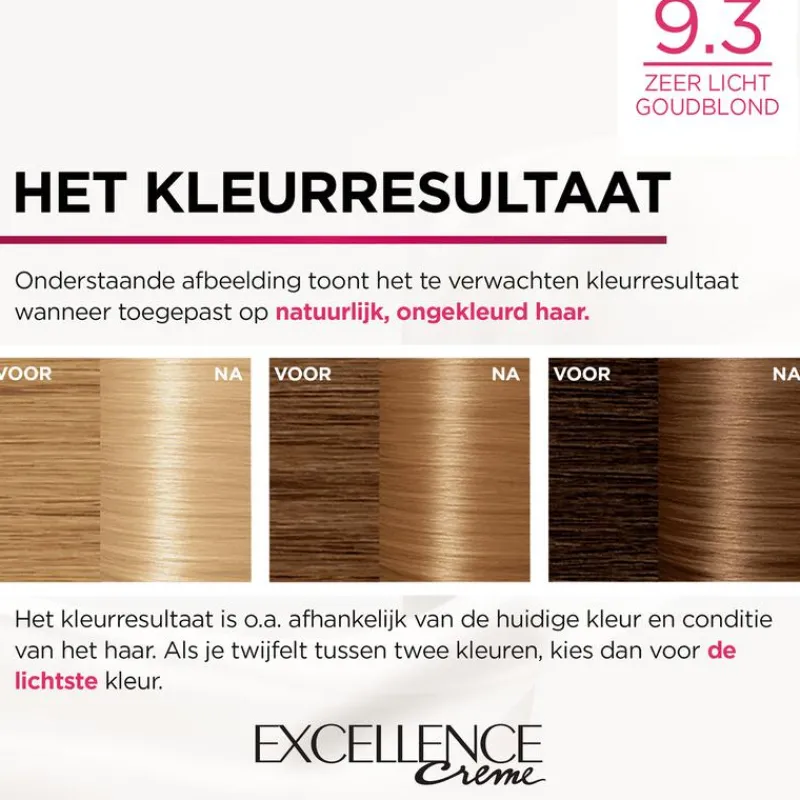 L’Oréal Paris Excellence Crème is een permanente haarkleuring met tot 100% grijsdekking, en een rijke en levendige kleur. De nieuwe en verbeterde formule verrijkt met hyaluronzuur zorgt voor een langhoudende kleur die 2x rijker* oogt. Het drievoudig verzorgende systeem bevat een beschermende crèmekleuring, een zachte pH shampoo voor de hoofdhuid, en een voedend haarmasker die zorgen voor glanzend, soepel en levendig haar. Verrijkt met pro-keratine, hyaluronzuur en een ingebouwd serum, versterkt de formule het haar en biedt bescherming tijdens het kleuren.