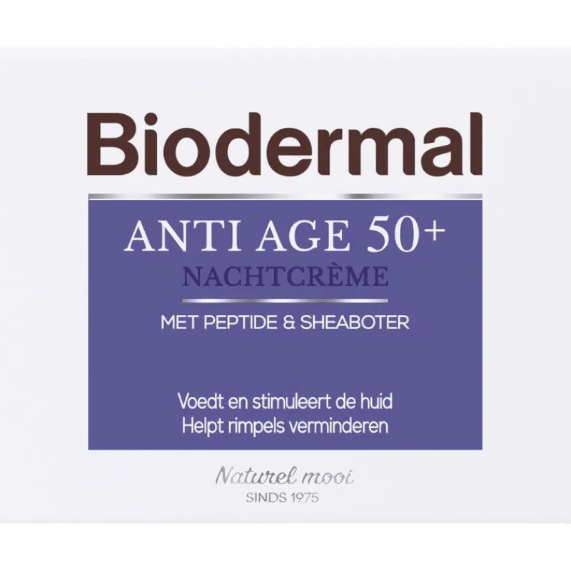 Het verouderingsproces versnelt vanaf het 50e levensjaar. Biodermal Anti Age 50+ Nachtcrème voedt en hydrateert de huid intensief gedurende de nacht. De verzorgende ingrediënten stimuleren de celvernieuwing, herstellen de vochtbalans en geven de huid haar veerkracht terug. De elasticiteit is verbeterd en de huid voelt zacht en glad aan.