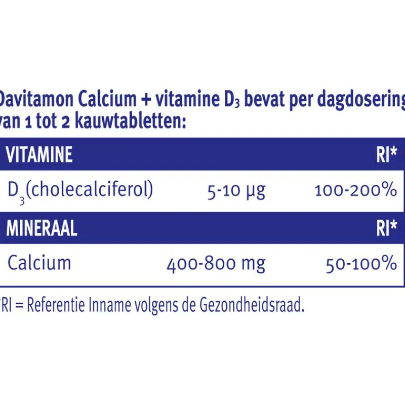 Davitamon Calcium met Vitamine D is een voedingssupplement dat speciaal is ontwikkeld voor volwassenen die behoeften hebben aan extra Calcium en vitamine D. Calcium is nodig voor het behoud van sterke botten en speelt een rol bij het behouden van soepele spieren. Davitamon Calcium kauwtabletten met Vitamine D, 100% van de ADH, zijn: