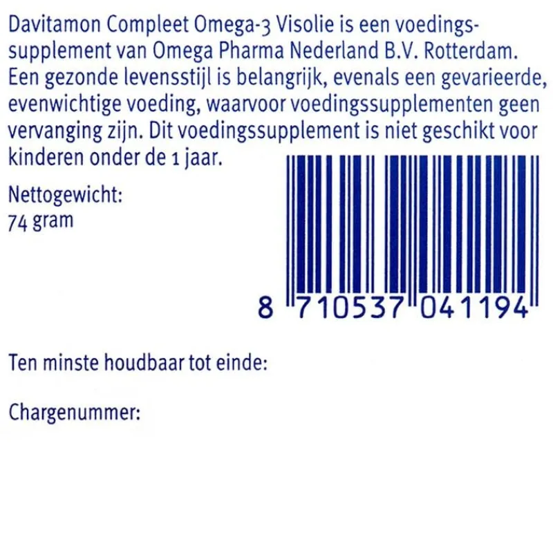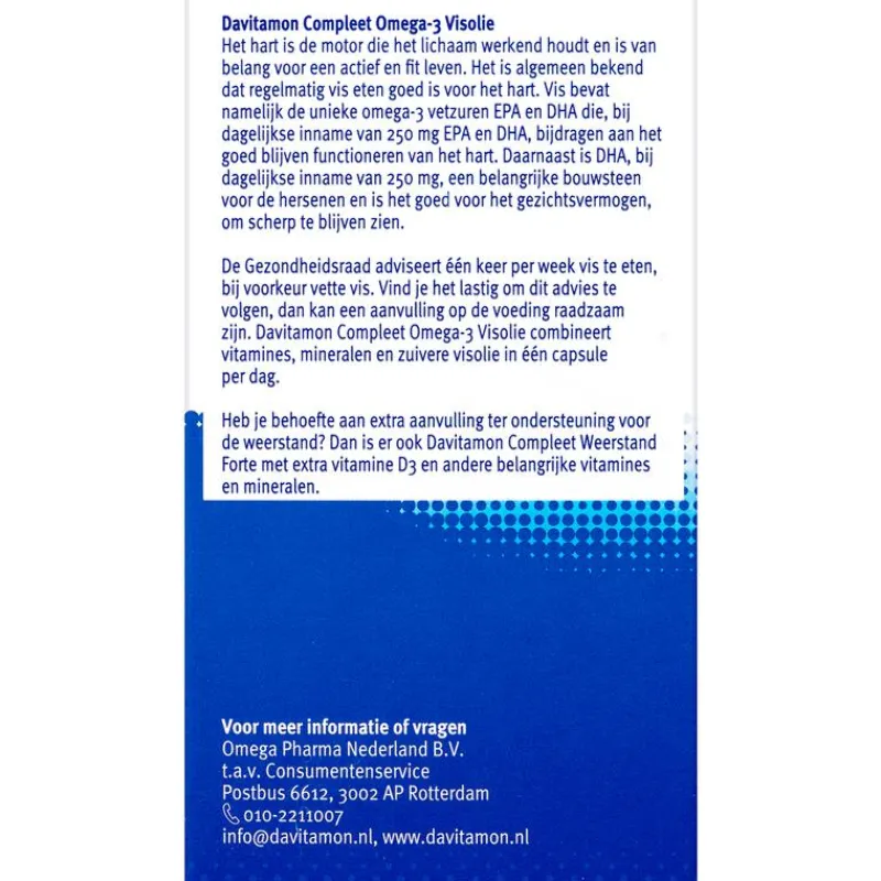 Davitamon Compleet Omega-3 Visolie is een complete multivitamine voor volwassenen die voorziet in een dagelijkse aanvulling van vitamines en mineralen, aangevuld met Omega-3 visolie. Hierdoor is Davitamon Compleet Omega-3 Visolie: