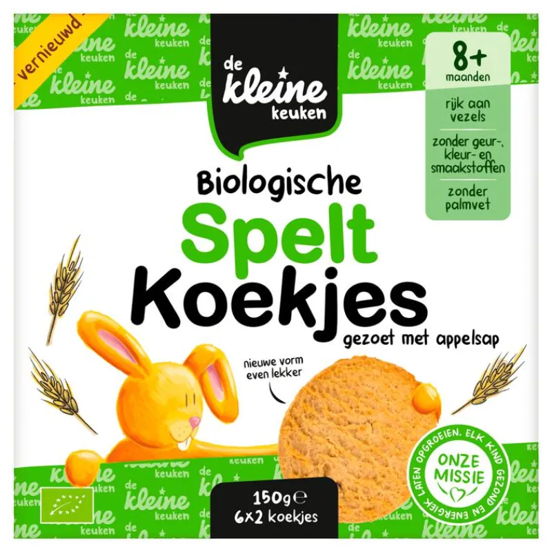 Deze koekjes zijn gemaakt met lekker veel volkoren spelt en haver. Waardevolle granen waar je kleine echt iets aan heeft! De koekjes bevatten alleen van nature aanwezige suikers, en zijn rijk aan ijzer, koper en natuurlijk vezels. Een goed koekje voor kleine buikjes!