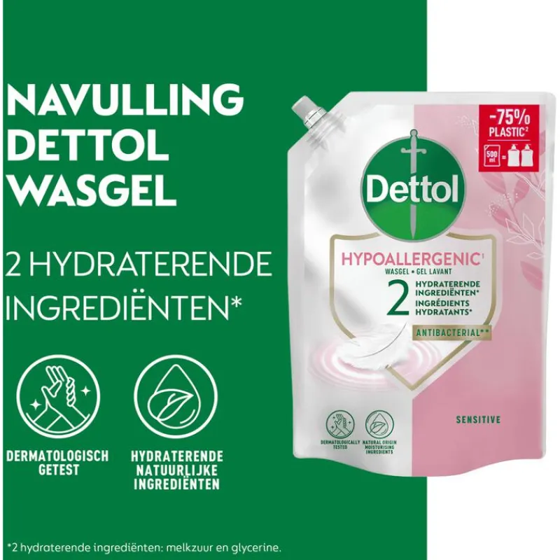 Dettol Hypoallergenic (Sensitive) wasgel navulling is verrijkt met twee hydraterende natuurlijke ingrediënten, die je huid intensief voeden. Deze wasgel is antibacterieel** en helpt de verspreiding van bacteriën te voorkomen. De dermatologisch geteste formule behoudt de natuurlijke pH-waarde van je huid en is geschikt voor gevoelige huid. 75% minder plastic in vergelijking met 2 flessen Dettol wasgel.