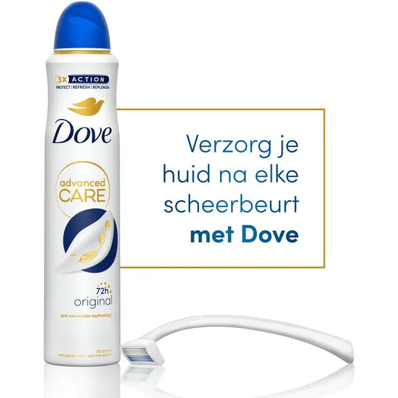 Dove Advanced Care Original Anti-Transpirant Deodorant Spray met een frisse geur beschermt tegen zweet én is lief voor je oksels. Het Advanced Care assortiment van Dove met de verbeterde formule met Pro-Ceramide serum maakt deel uit van de meest verzorgende lijn van Dove. De spray biedt onmiddellijke verlichting na het scheren, helpt de okselhuid te herstellen en beschermt tot 72 uur tegen zweet en lichaamsgeur. Bovendien bevat deze milde formule 0% alcohol. De hele dag een fris en verzorgd gevoel – wat de dag je ook brengt!
