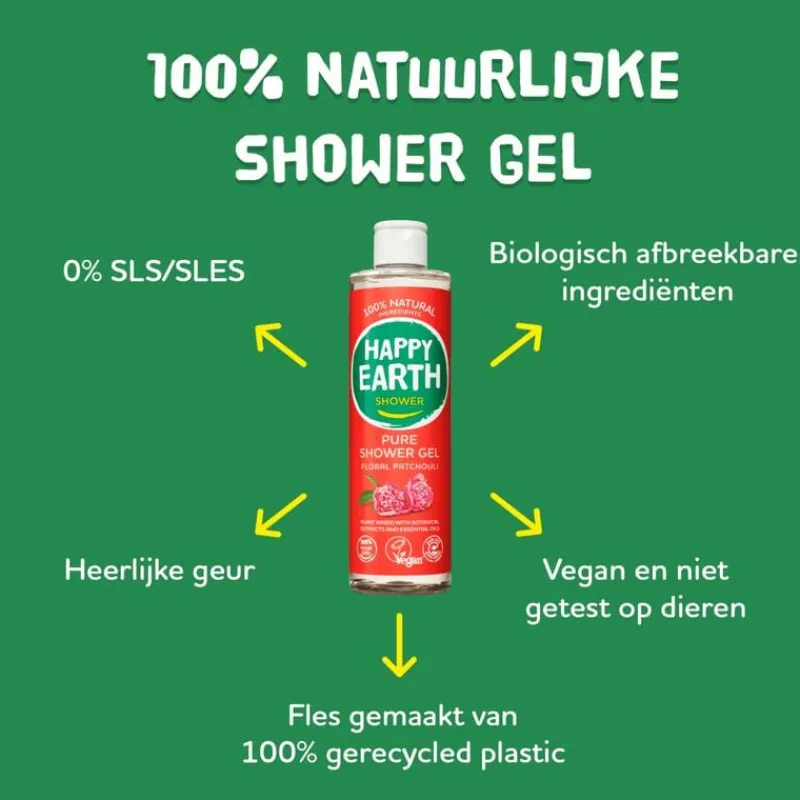 Happy Earth 100% natuurlijke Douchegel Floral Patchouli is een 100% natuurlijke, vegan douchegel die gemaakt is van ingrediënten waar je huid en de aarde blij van worden. Alle ingrediënten in deze body lotion zijn gecertificeerd 100% natuurlijk en hebben de Natrue en Vegan Society keurmerken. Als je iets op je huid aanbrengt en door het doucheputje spoelt, is het fijn om te weten dat er geen vervuilende en vervelende ingrediënten in zitten zoals SLS/SLES, parabenen, kleurstoffen of andere nare toevoegingen. Alle douchegels van Happy Earth zijn vrij van microplastics en andere chemicaliën. Met deze shower gel zorg je goed voor jezelf en voor onze aarde!