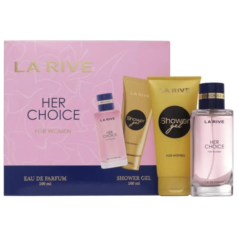 De giftset van La Rive Her Choice bevat een zeer populaire parfum, en dat voor een erg zacht prijsje! De geur van Her Choice is er eentje om verliefd op te worden! De geur opent lichtzoet met bergamot en oranjebloesem. Maar over het algemeen kent deze geur een bloemig karakter op basis van jasmijn, witte musk en vanille. De parfum kan door eenieder gedragen worden en tijdens ieder moment van de dag! De bijpassende showergel versterkt de parfum door deze langer vast te houden en biedt daarnaast een heerlijke verzorging voor de huid.