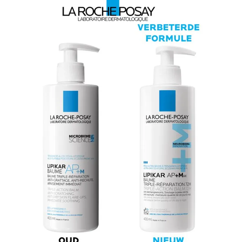 La Roche-Posay Lipikar Balsem AP+Max is een nieuwe, drievoudig werkende balsem, specifiek ontwikkeld voor een zeer droge huid met neiging tot atopisch eczeem. Deze geavanceerde formule, verrijkt met voedende Sheaboter, het innovatieve Neurobioma en kalmerende Niacinamide, werkt synergetisch om de huid te helpen herstellen. Het helpt jeuksensaties tot 24 uur lang te verminderen*, voedt intensief en herstelt de huidbarrière. Bovendien vermindert het ongemak en roodheid, wat resulteert in een 72u verzachting voor droge huid**.