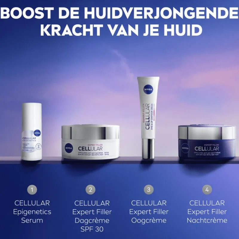 Ontdek baanbrekende huidverzorging met het NIVEA Cellular Epigenetics Serum 30ml. Dankzij de gepatenteerde Age Clock Technologie en krachtige werking van EPICELLINE® draait dit serum tot wel 10 zichtbare tekenen van huidveroudering terug in 2 weken. Klinisch bewezen resultaten tonen een vermindering van rimpelvolume (-24%), een vollere huid (+47%), meer elasticiteit (+20%) en een zichtbare glow (+20%). Verrijkt met 3 typen Hyaluronzuur, hydrateert het serum intensief (+36%) en maakt het de huid gladder, steviger en weerbaarder. Al na 1 keer gebruiken merkt 88% een stralender effect, na 7 dagen 93% een vollere huid en na 4 weken ervaart 100% een jonger uitziende huid***. De formule is klinisch getest en ontwikkeld om diep in te werken op celniveau. Kies voor het NIVEA Cellular Serum en geef je huid een krachtige boost richting jeugdige uitstraling en stevigheid. *Klinische studies, 3-43 vrouwen – zelfscore, expert score, instrumentele meting – na 2 weken. **Klinische studie met 43 vrouwen, 2 weken, 98% vertoonde tekenen van een jonger uitziende huid (verbetering van stevigheid/elasticiteit, liftend effect, uitstraling). ***Klinische studie, 43 vrouwen.