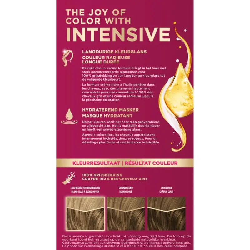 - Met hydraterend masker: na de haarkleuring voelt het haar diep gehydrateerd en zijdezacht aan. Het is makkelijk doorkambaar en heeft een onweerstaanbare glans.