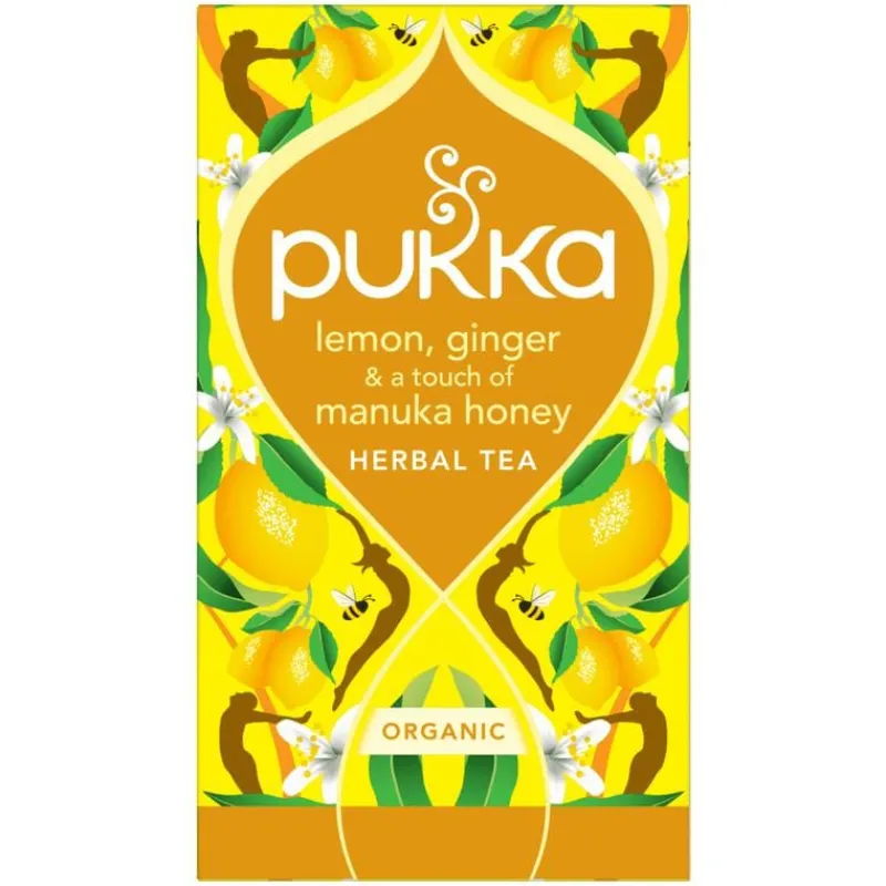 Heerlijk verzachtend, ontspan en geniet van de frisse, verwarmende smaak van Lemon, Ginger & Manuka Honing thee van Pukka.