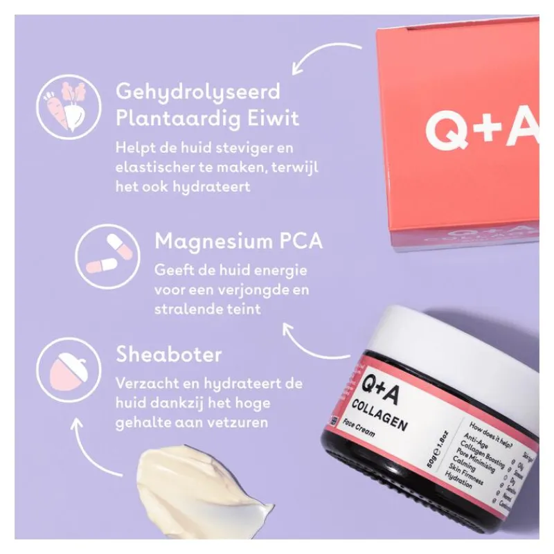 Q+A Collagen Face Cream is een rijke, hydraterende crème voor dagelijks gebruik. De unieke formule met ingrediënten zoals plantaardig collageen en rijke, hydraterende oliën verzachten je fijne lijntjes en geven de ultieme voeding. Je geeft de rijpere huid alle verzorging die nodig is!