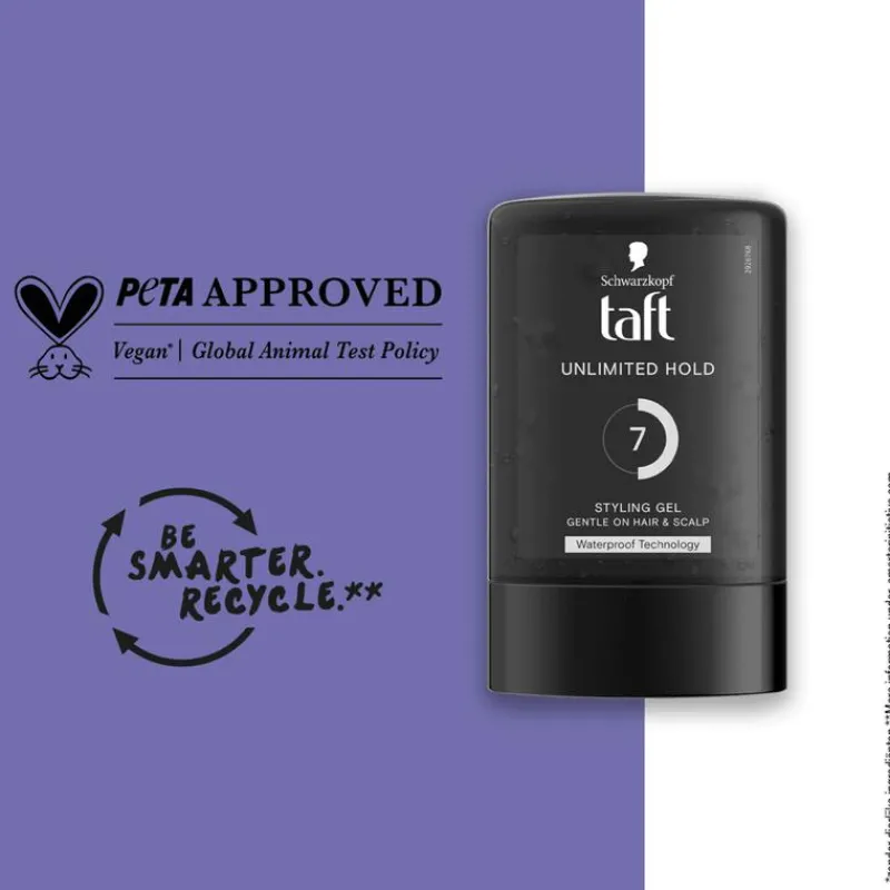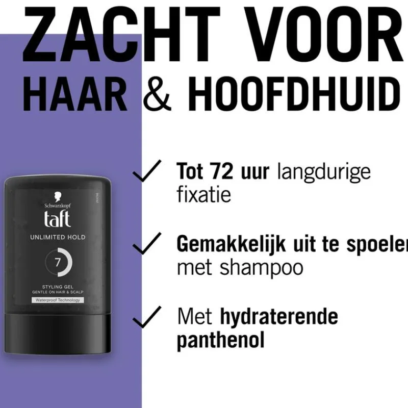 Wil je er verzekerd van zijn dat je haar de hele dag in model blijft? Taft Unlimited Hold styling haargel is de oplossing! Een sterke gel met tot wel 72u fixatie en waterproof technologie. Het is gemakkelijk uit te wassen met shampoo.