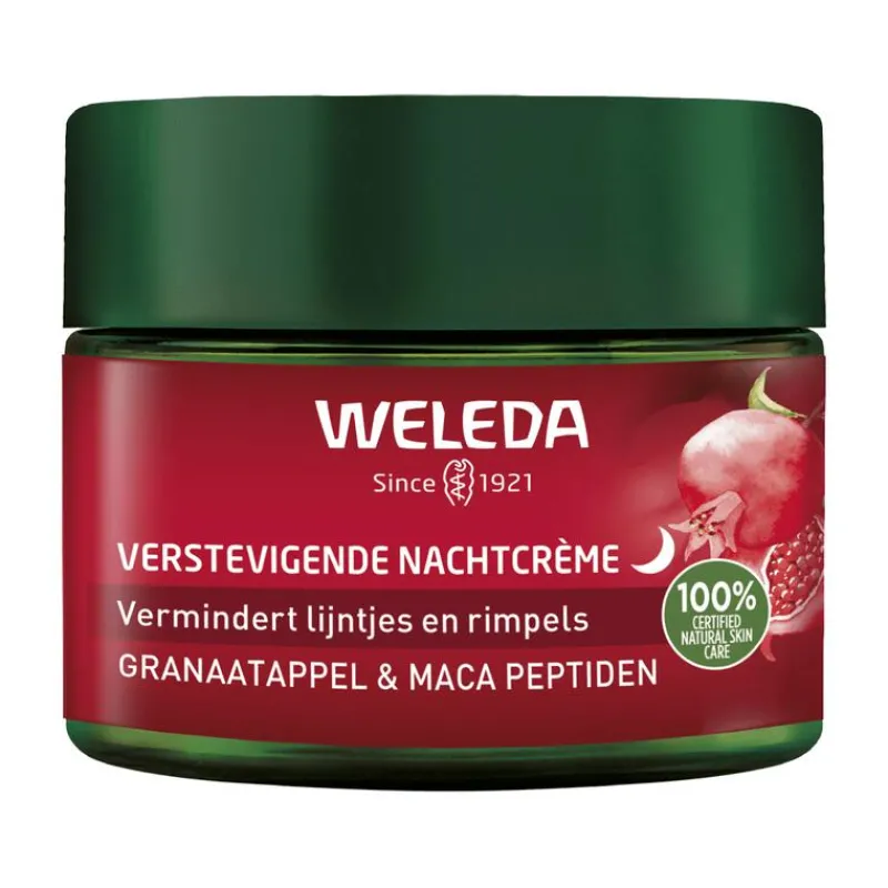 Weleda Verstevigende Nachtcrème stimuleert de celvernieuwing en laat de huid stralen met 100% natuurlijk ingrediënten. De crème bevat granaatappelpitolie, een fantastische bron aan antioxidanten, en peptiden van biologische macawortel die de huidcellen een energieboost geven. Samen verminderen deze krachtige ingrediënten tekenen van huidveroudering.