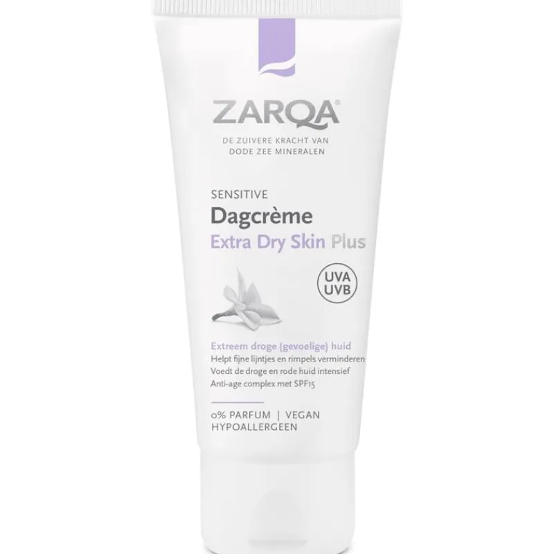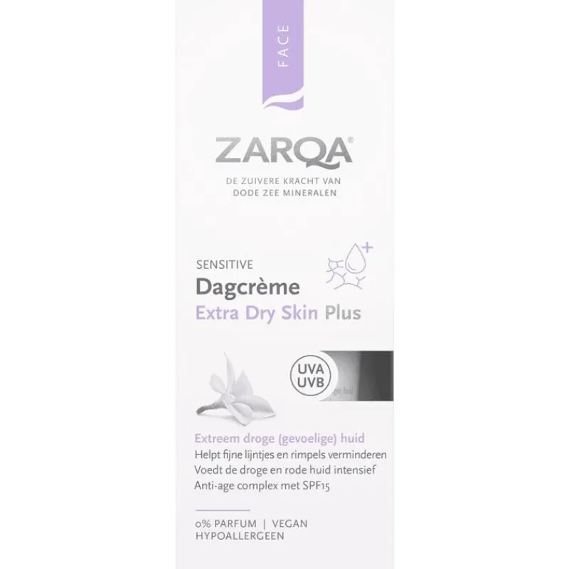 ZARQA Dagcrème Extra Dry Skin Plus – met anti-age complex en SPF15 – is een rijk hydraterende dagcrème op oliebasis, die de extreem droge (gevoelige) huid intensief beschermt, voedt en verzorgt. Dode Zee mineralen, amandelolie, magnesium en hydrocomplex met hyaluronzuur ondersteunen en beschermen op krachtige wijze tegen uitdroging en huidveroudering. De crème helpt droge huidschilfers verminderen en verzacht ruwe en schrale plekjes. Het helpt fijne lijntjes en rimpels verminderen, de droge en rode huid kalmeren en maakt de huid zacht en soepel.
