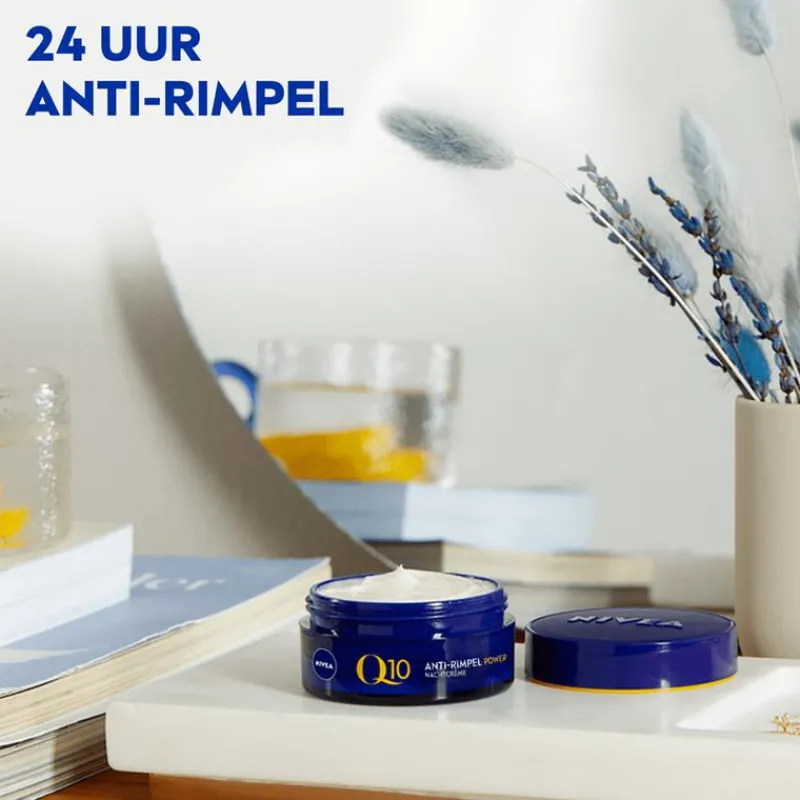 Verstevig de huid en laat rimpels zichtbaar verdwijnen met NIVEA Q10 POWER Anti-Rimpel Nachtcrème. Terwijl jij ligt te slapen, doet deze krachtige nachtcrème zijn werk. De NIVEA Q10 POWER Anti-Rimpel Nachtcrème bestrijdt fijne lijntjes en rimpels, maar zorgt er ook voor dat je huid voelbaar steviger is. Ook wanneer je wakker bent, geniet je nog 24 uur lang van de voedende kracht van deze nachtcrème. Deze anti-rimpel gezichtsverzorging bevat verschillende bestanddelen die de huid voeden en egaler maken. Ontdek de kracht van Q10 die identiek is aan de huideigen Q10. Deze stof ondersteunt het herstellend vermogen van je huidcellen en draagt zo bij aan een jonger ogend gelaat. Daarnaast vind je ook creatine in de Q10 antirimpelcrème voor vrouwen. Dit stofje geeft je cellen een energieboost en stimuleert de aanmaak van collageen. Hierdoor voelt je huid steviger aan en worden rimpels en fijne lijntjes opgevuld. • Voedt de huid terwijl je slaapt • Vermindert rimpels en fijne lijntjes • Stimuleert de aanmaak van collageen • Met lichaamseigen Q10-enzym en creatine • Geschikt voor alle huidtypen