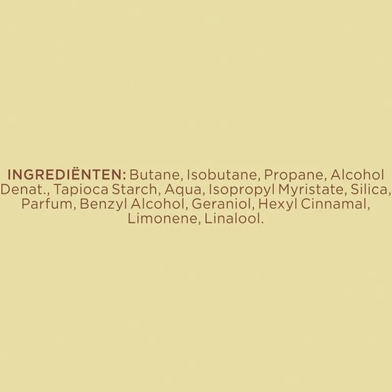 Butane, Isobutane, Propane, Alcohol Denat., Tapioca Starch, Aqua, Isopropyl Myristate, Silica, Parfum, Benzyl Alcohol, Geraniol, Hexyl Cinnamal, Limonene, Linalool.