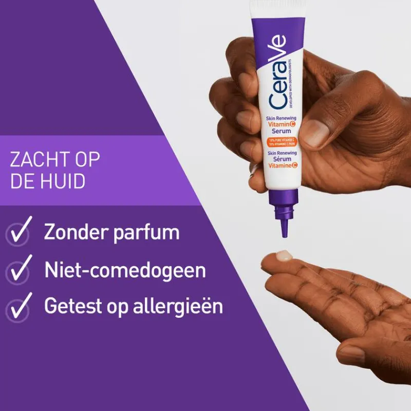 Het CeraVe Skin Renewing Vitamine C Serum is een serum dat geschikt is voor alle huidtypes, zelfs een gevoelige huid. De milde formule bevat 10% pure vitamine C. Dit ingrediënt helpt de huid te verhelderen en te beschermen tegen oxidatieve stress, terwijl de 3 essentiële ceramiden de natuurlijke huidbarrière helpen herstellen en ondersteunen. De gepatenteerde MVE-technologie zorgt voor een geleidelijke afgifte van actieve ingrediënten, waardoor de huid tot 24 uur lang gehydrateerd wordt*. Na 8 weken ziet de huid er zichtbaar helderder uit** met minder fijne lijntjes en pigmentvlekken***. Het CeraVe Skin Renewing Vitamine C Serum is hypoallergeen, niet-comedogeen en is ontwikkeld in samenwerking met dermatologen, waardoor het ideaal is voor een gevoelige huid. De lichte, snel absorberende textuur is niet vet of plakkerig. Gebruik het serum als onderdeel van je dagelijkse routine en combineer het met andere CeraVe producten voor een optimaal resultaat. *Instrumentele test, 26 personen **Zelfevaluatie bij 55 consumenten. ***Klinische studie bij 55 personen na 8 weken dagelijks gebruik.