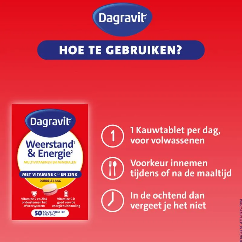 Gebruiksaanwijzing en aanbevolen gebruik per dag: Volwassenen: 1 kauwtablet per dag. Bij voorkeur innemen tijdens of na de maaltijd. De aanbevolen dagelijkse dosering niet overschrijden. Dit voedingssupplement is niet geschikt voor gebruik door kinderen onder 12 jaar. Overmatig gebruik kan een laxerend effect hebben.Dagravit Totaal 30 Weerstand & Energie bevat geen conserveermiddelen.