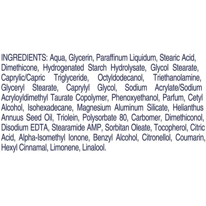 Aqua, Glycerin, Paraffinum Liquidum, Stearic Acid, Dimethicone, Hydrogenated Starch Hydrolysate, Glycol Stearate, Caprylic/CapricTriglyceride, Octyldodecanol, Triethanolamine, Glyceryl Stearate, Caprylyl Glycol, Sodium Acrylate/Sodium Acryloyldimethyl Taurate Copolymer,Phenoxyethanol, Parfum, Cetyl Alcohol, Isohexadecane, Magnesium Aluminum Silicate, Helianthus Annuus Seed Oil, Triolein, Polysorbate 80,Carbomer, Dimethiconol, Disodium EDTA, Stearamide AMP, Sorbitan Oleate, Tocopherol, Citric Acid, Alpha-Isomethyl Ionone, Benzyl Alcohol, Citronellol, Coumarin, Hexyl Cinnamal, Limonene, Linalool.