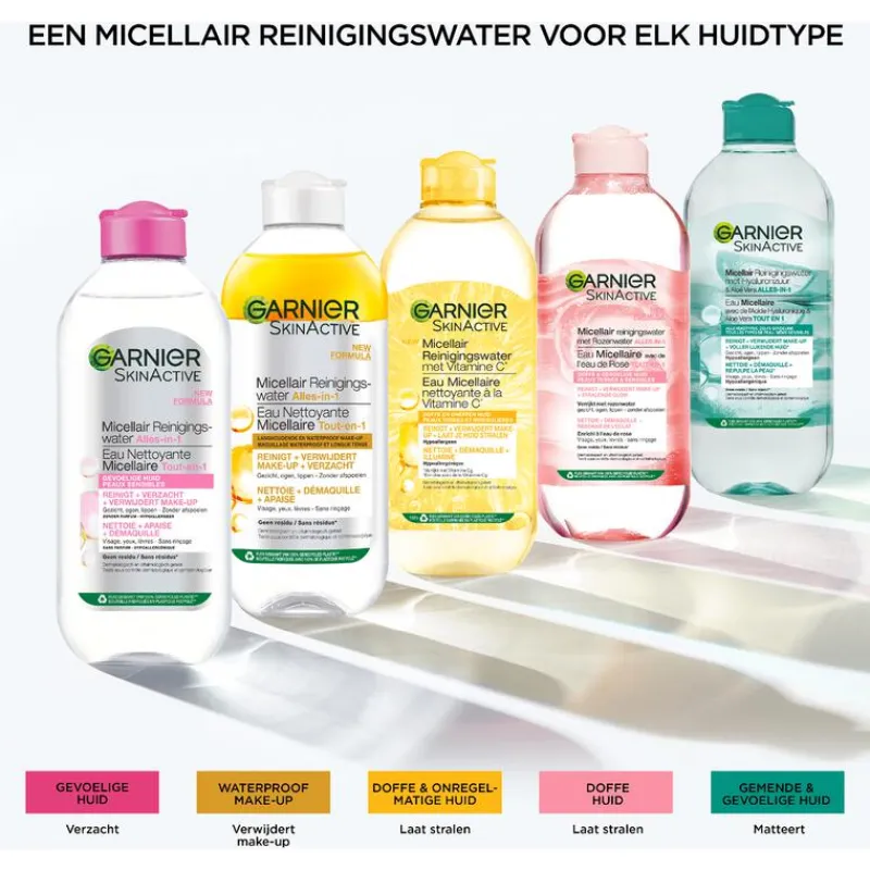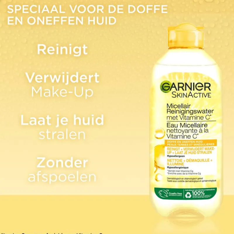 Micellair Reinigingswater is onze makkelijkste meest plezierige manier om jouw gezicht te reinigen, je make-up te verwijderen en de huid weer te laten stralen. En dat allemaal in één beweging zonder te spoelen. Onze nieuwste innovatie van Micellair, Vitamine C*, biedt de bekende voordelen met een fruitige twist. Zoals u gewend bent van ons, reinigt het de huid, verwijdert de Micellair make-up en verzacht het de huid. Daarbij is er Vitamine C* toegevoegd. Dit alsmaar populairder wordende ingrediënt zorgt voor een stralend effect en vereffend de huid. Kortom: Gebruik Micellair Water met Vitamine C om jouw doffe & oneffen huid weer te laten stralen. *Vitamine Cg is een afgeleide van Vitamine C **behalve etiket, additieven & dop. Ontdek ook de andere Vitamine C producten van Garnier voor een ultieme glow! Alle producten van Garnier wereldwijd zijn officieel goedgekeurd door Cruelty Free International onder het Leaping Bunny Program, een toonaangevende organisatie die zich inzet voor het beëindigen van dierproeven wereldwijd en de erkende Cruelty Free Gold Standaard.