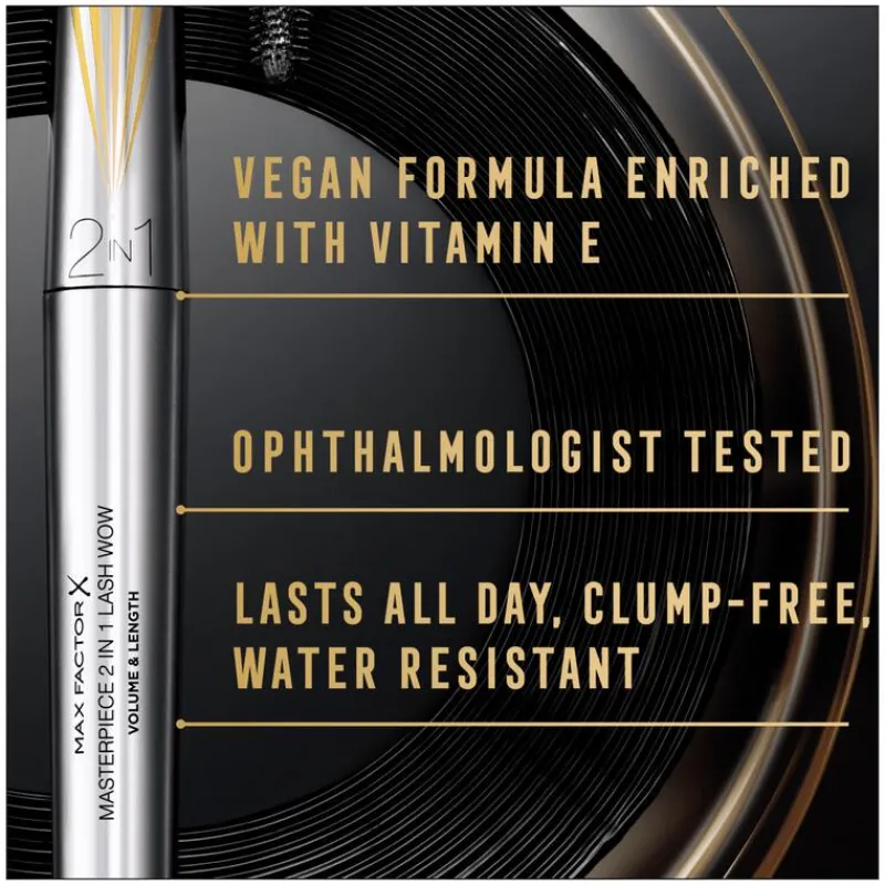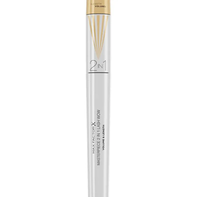 De Max Factor Masterpiece 2 In 1 Lash Wow Mascara zorgt ervoor dat wimpers langer lijken en geeft ze een echte volumeboost. Kies jouw favoriete make-uplook door het unieke, eenvoudig te gebruiken borsteltje simpelweg om te draaien en ga voor maximale resultaten. Verleng en separeer, of lift en geef volume: de keuze is aan jou! De vegan formule bevat weldadige ingrediënten die je wimpers verzorgen. De mascara schilfert niet, is makkelijk zonder klontertjes aan te brengen en blijft de hele dag lang mooi zitten, zonder af te geven. De langhoudende, gladde formule van deze volumeverhogende en verlengende mascara is eenvoudig en nauwkeurig aan te brengen over de hele lengte en zelfs op de wimpers in de binnenste ooghoeken. De formule is oftalmologisch getest, waardoor deze Max Factor mascara geschikt is voor personen met gevoelige ogen of personen die contactlenzen dragen. Geef jouw wimpers die WOW-factor!