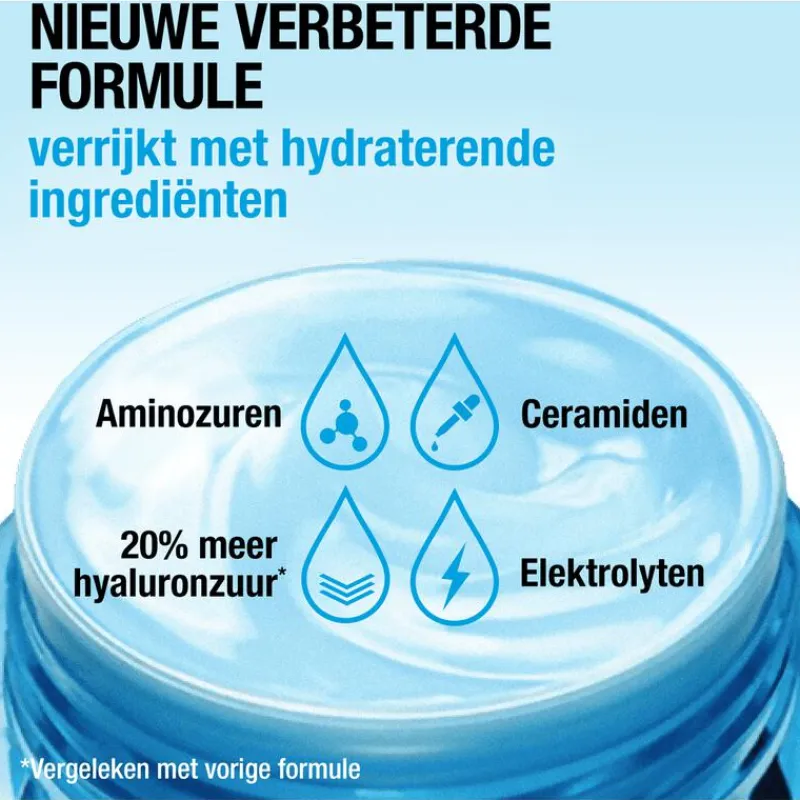 Ontdek nu de nieuwe en verbeterde Hydro Boost formule van Neutrogena! Dankzij de nieuwe formule en hydraterende ingrediënten zoals: aminozuren, elektrolyten, hyaluronzuur en ceramiden wordt de huid tot wel 6x meer gehydrateerd gedurende 72 uur. Dit resulteert in een soepele, gezond uitziende huid met een 80% sterkere huidbarrière.De nieuwe formule bevat 20% meer hyaluronzuur dat helpt vocht vast te houden en de hydratatie te verhogen. Het aminozuur versterkt de huid en zorgt voor extra ondersteuning van de huidbarrière. De elektrolyten bevorderen de opname van de ingrediënten en de ceramiden beschermen en kalmeren de vochtbarrière.De Neutrogena Hydro Boost Gel Crème is vrij van parfum, geschikt voor de droge huid en ontwikkeld in samenwerking met dermatologen. De nieuwe verpakking bevat 87% minder plastic en wordt geleverd in een 100% recyclebare glazen pot. Ontdek nu de nieuwe Neutrogena® Hydro Boost Gel Crème.