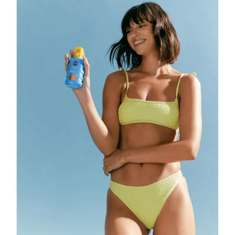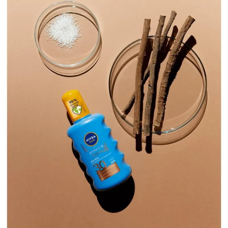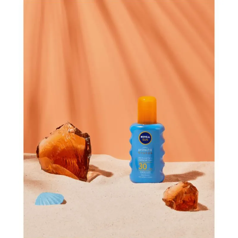 Met NIVEA SUN Protect & Bronze Zonnespray komt in een handige sprayflacon, die het product makkelijk over je huid vernevelt. Zo breng je direct een egale beschermingslaag aan, die je huid tegelijkertijd diep voedt. De formule van de spray is bijzonder licht en plakt niet. Tegelijkertijd is het een waterdichte spray. De perfecte zoonespray voor een dagje strand of zwembad. Het bijzondere aan NIVEA SUN Protect & Bronze Zonnespray is dat deze zonnebrand een bronzing effect heeft. De formule bevat geen zelfbruiner, maar pro-melanine extract. Dit is een stof die de aanmaak van natuurlijke melanine stimuleert, waardoor het natuurlijke bruiningsproces sneller gaat. Zo geniet je sneller en langer van een bruine tint. Dankzij SPF 30 beschermt de zonnebrand je tegen uv A/uv B. Zo hoef je je geen zorgen te maken over huidschade en vroegtijdige huidveroudering.